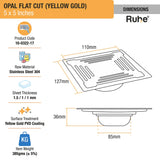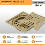 Ruhe Opal Flat Cut Floor Drain built with 1mm Thick 304-Grade Stainless Steel and beautiful Yellow Gold PVD Coating offers a luxurious look, fast-drainage, prevention of odour, pests and blockages and comes with 10 years warranty.