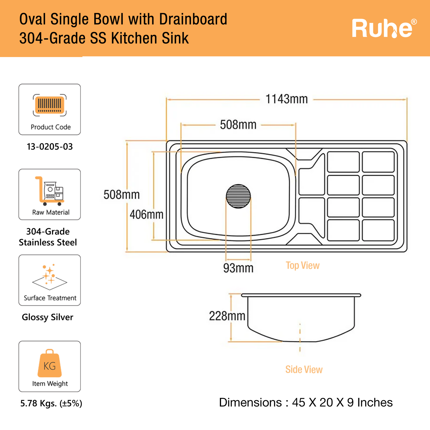 Oval Single Bowl with Drainboard Kitchen Sink (45 x 20 x 9 Inches) - 304 is backordered and will ship as soon as it is back in stock.