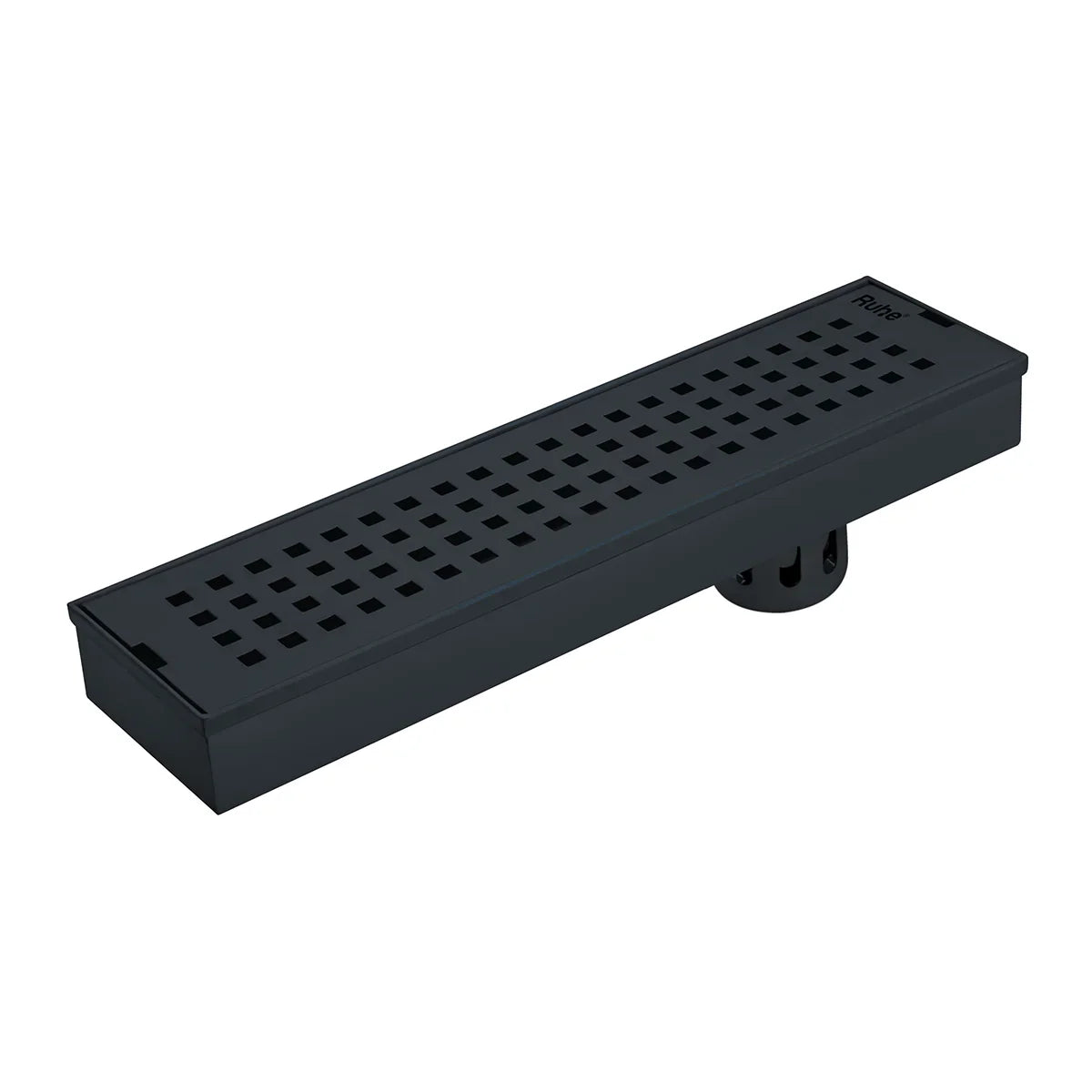 Ruhe Palo Shower Drain Channels made with 1mm Thick 304-Grade Stainless Steel have a beautiful Black PVD Coating that offers a luxurious look and are meant to handle large volumes of water, come with a Side Hole (customizable), Drain Frame/Tray, Grating Top, Cockroach Trap and a 10 Year Warranty.