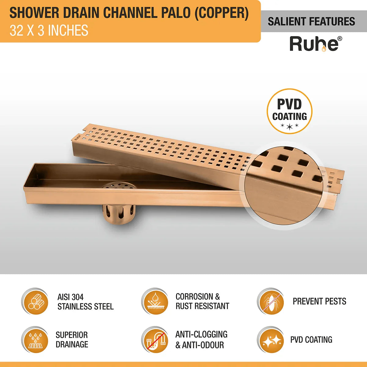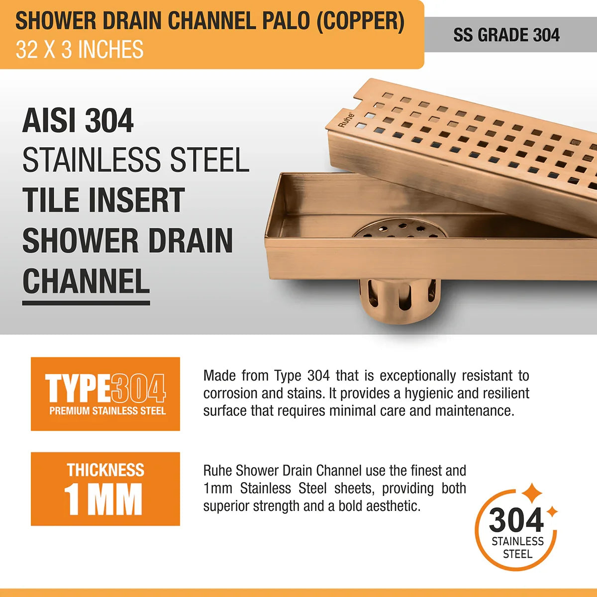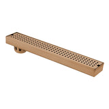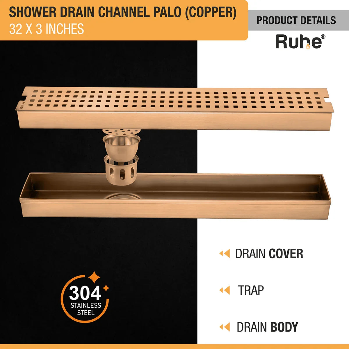 Ruhe Palo Shower Drain Channels made with 1mm Thick 304-Grade Stainless Steel have a beautiful Rose Gold PVD Coating that offers a luxurious look and are meant to handle large volumes of water, come with a Side Hole (customizable), Drain Frame/Tray, Grating Top, Cockroach Trap and a 10 Years Warranty.