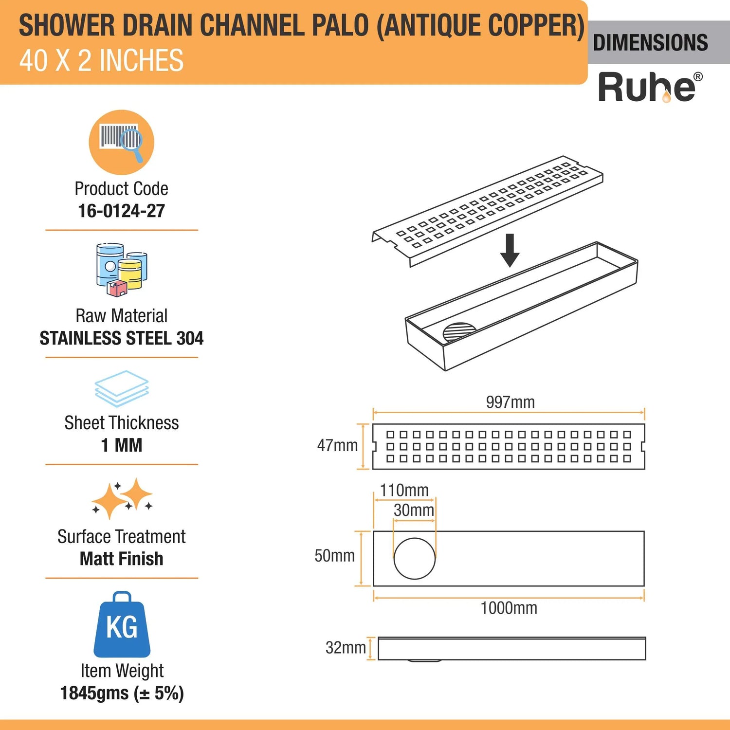 • Drain Channels are manufactured in  1mm Thick AISI 304-Grade Stainless Steel having 18% Chromium and 8% Nickel composition that actively resists rusting for a longer time.