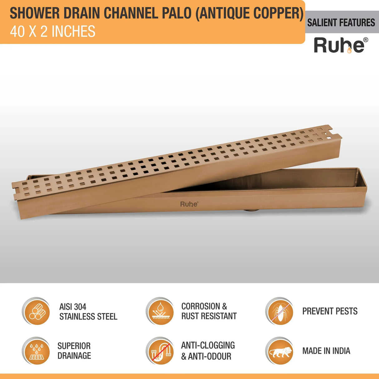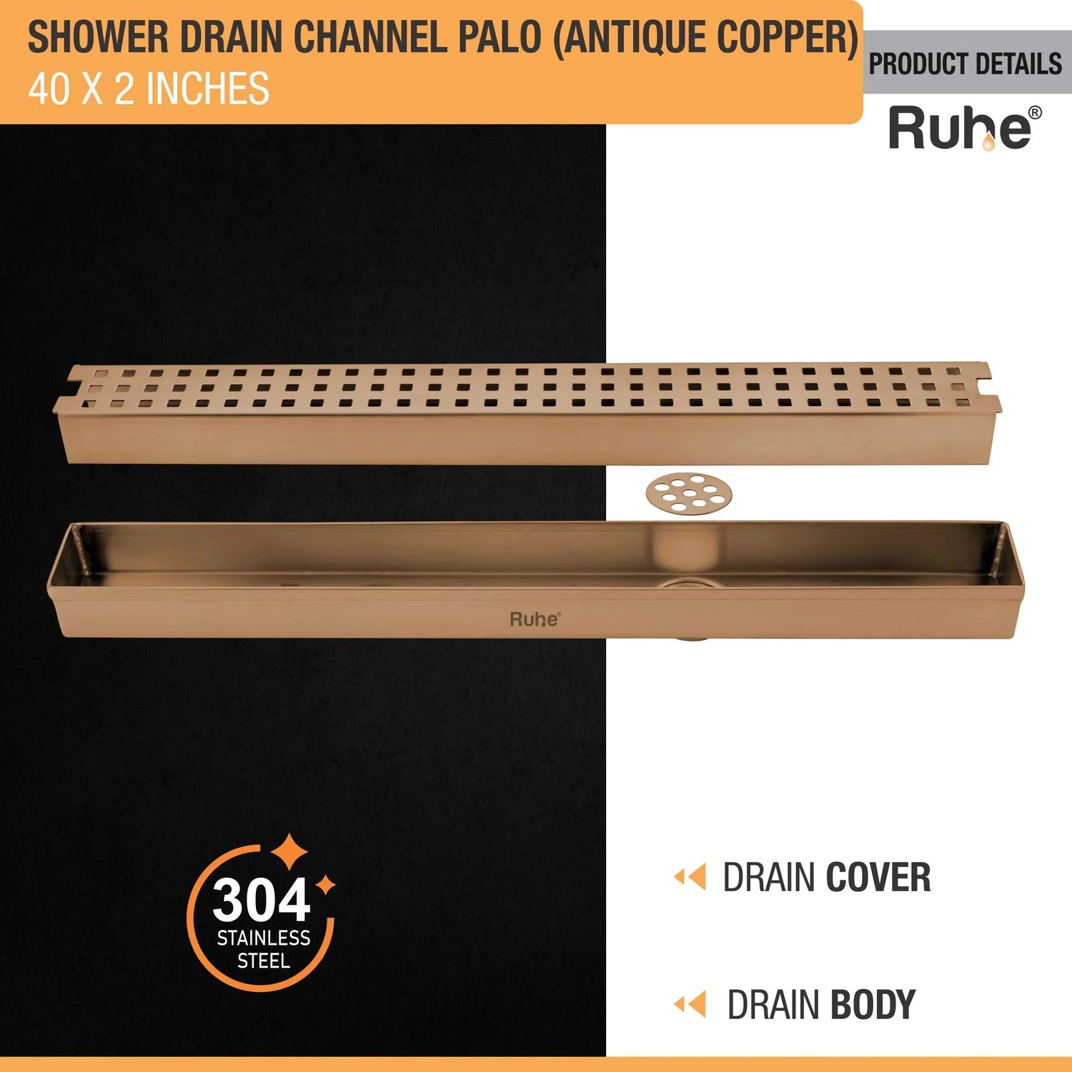 Ruhe Palo Shower Drain Channels made with 1mm Thick 304-Grade Stainless Steel have a beautiful Rose Gold PVD Coating that offers a luxurious look and are meant to handle large volumes of water, come with a Side Hole (customizable), Drain Frame/Tray, Grating Top and a 10 Year Warranty.