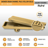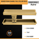 Ruhe Palo Shower Drain Channels made with 1mm Thick 304-Grade Stainless Steel have a beautiful Yellow Gold PVD Coating that offers a luxurious look and are meant to handle large volumes of water, come with a Side Hole (customizable), Drain Frame/Tray, Grating Top, Cockroach Trap and a 10 Years Warranty.
