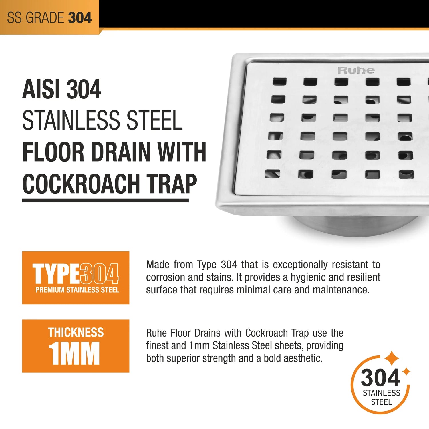 Pearl Square 304-Grade Floor Drain with Collar & Cockroach Trap...
