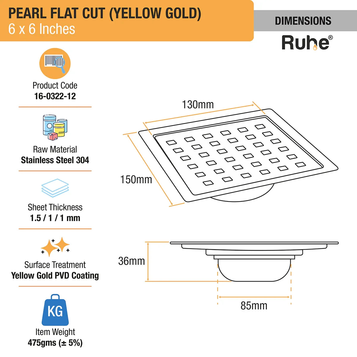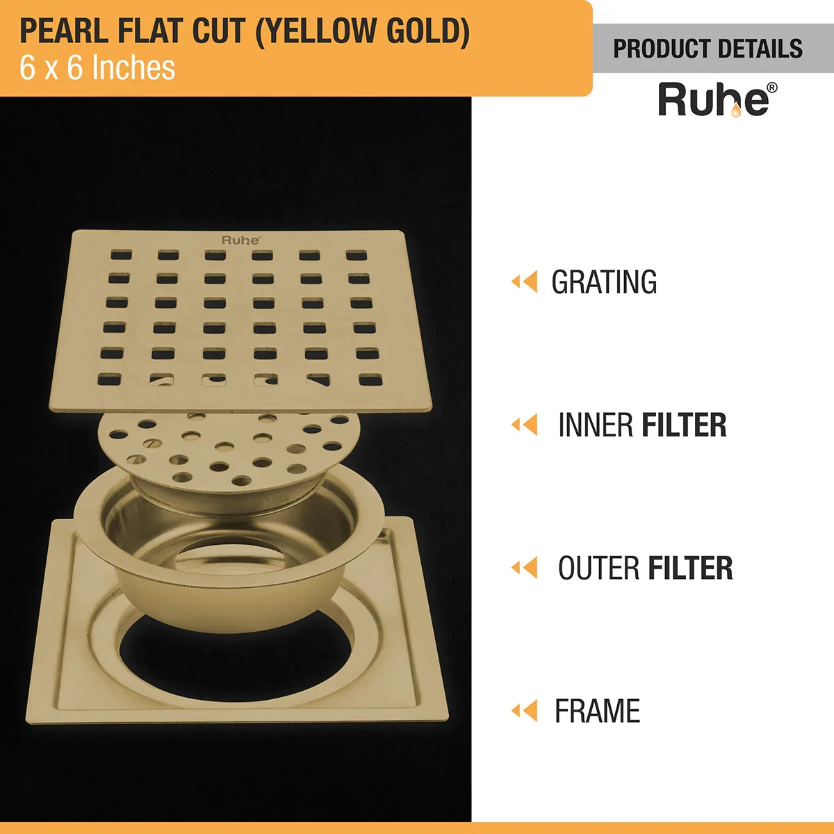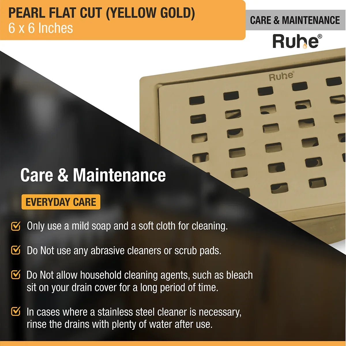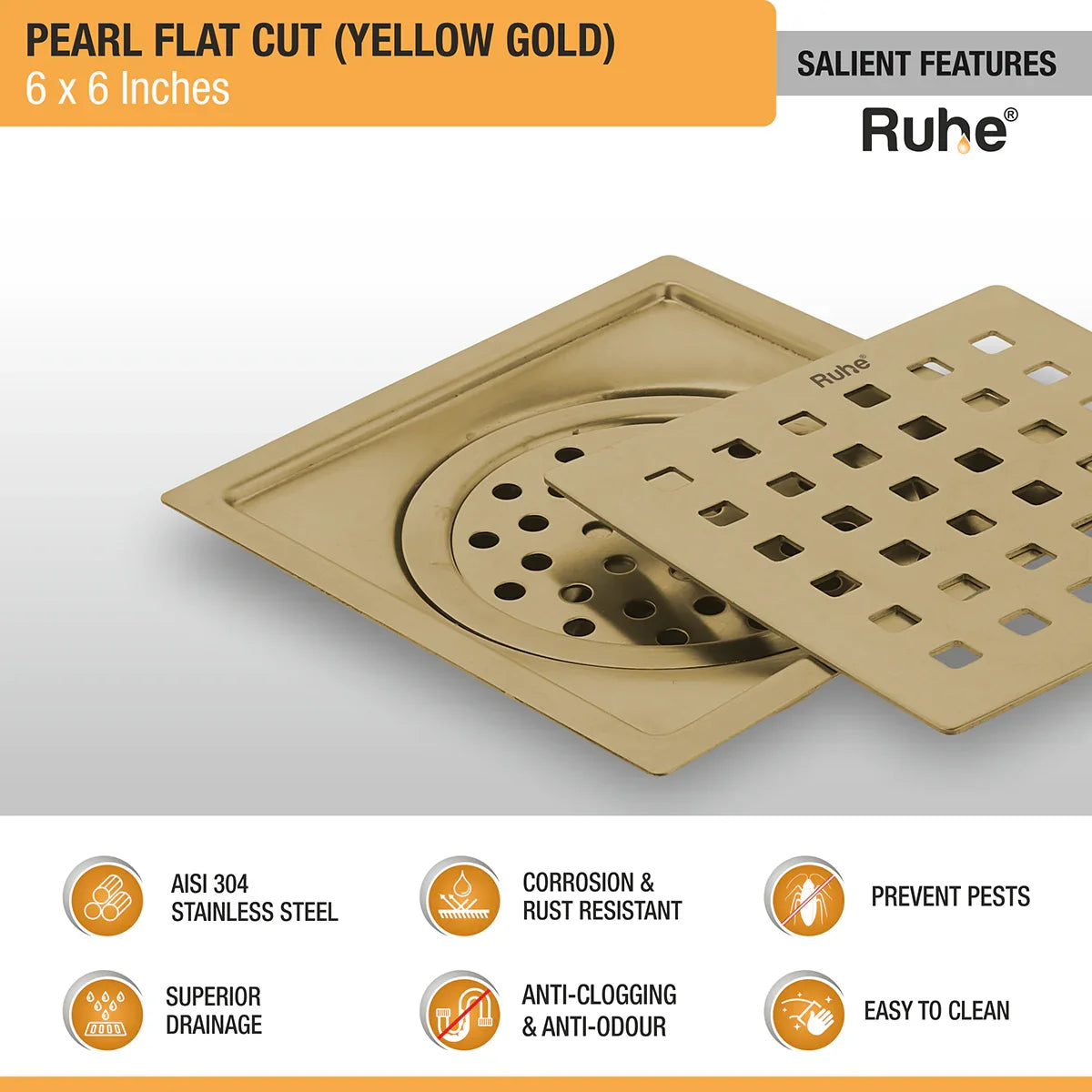 Pearl Square Flat Cut Floor Drain in Yellow Gold PVD Coating (6 x 6 Inches)