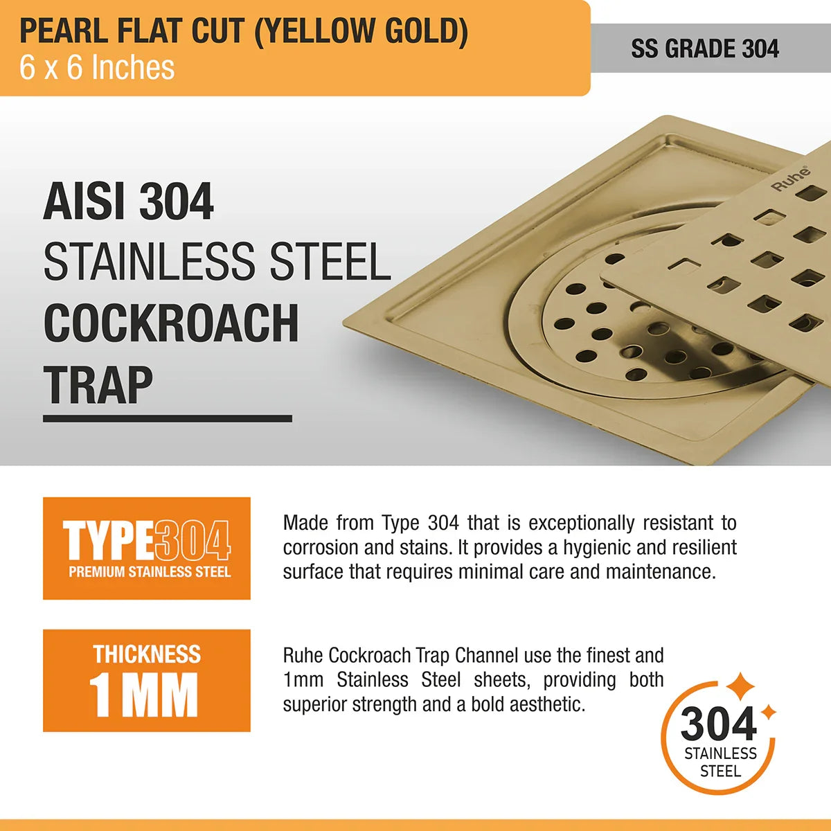 Ruhe Pearl Flat Cut Floor Drain built with 1mm Thick 304-Grade Stainless Steel and beautiful Yellow Gold PVD Coating offers a luxurious look, fast-drainage, prevention of odour, pests and blockages and comes with 10 years warranty.