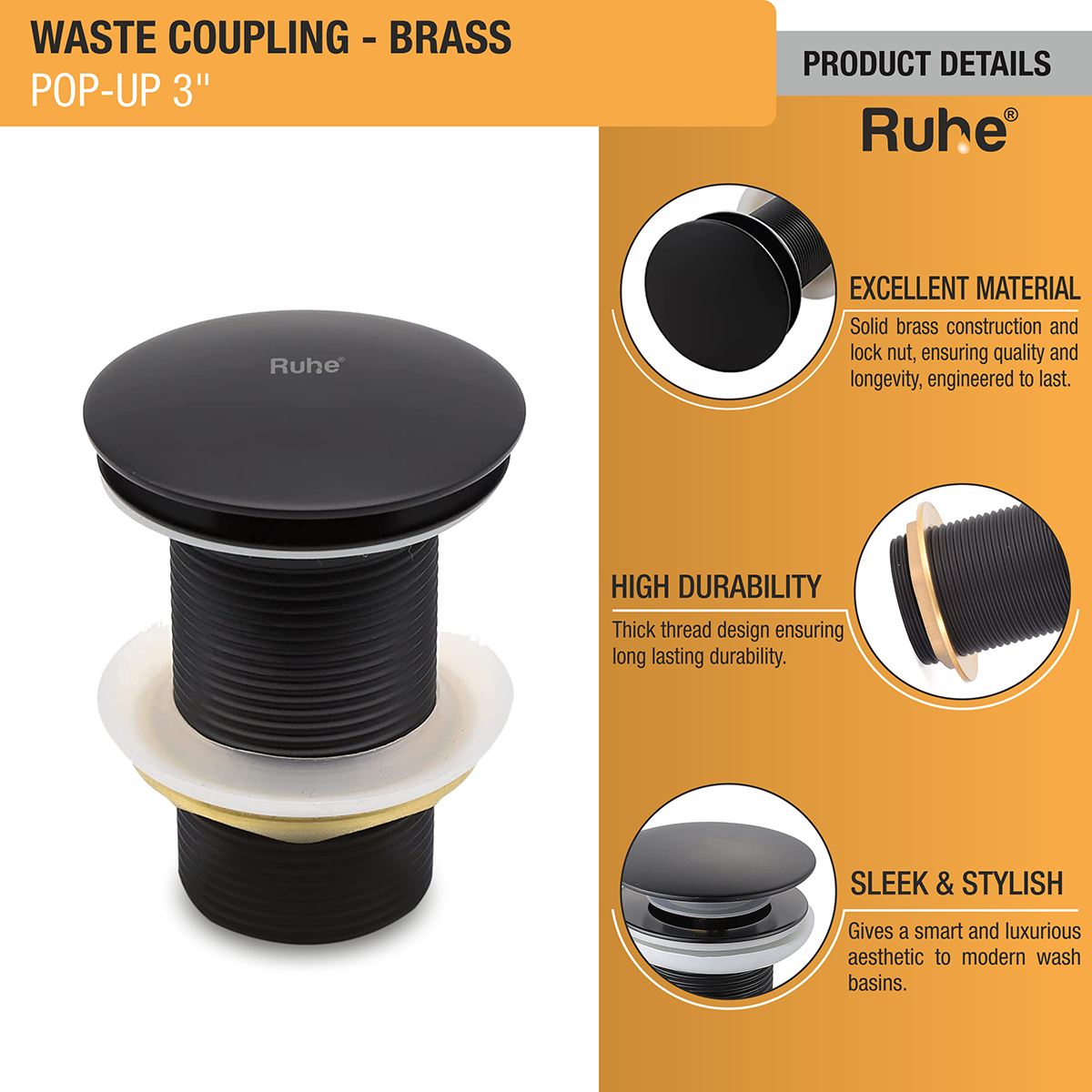 Ruhe Pop-up Waste Coupling is a perfect drainer for modern countertop and wall mount wash basins that gives a sophisticated look, allows quick drainage and comes with 1 year warranty.