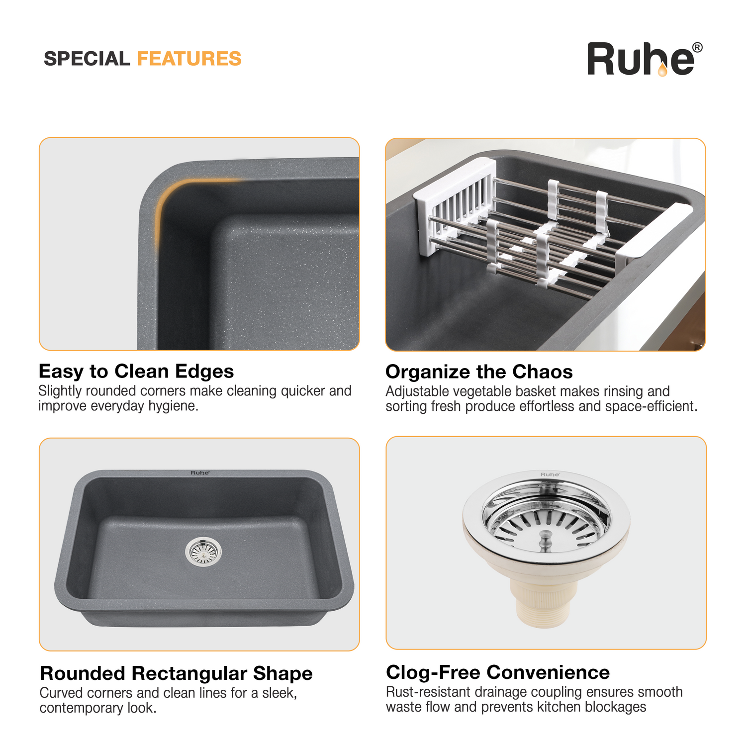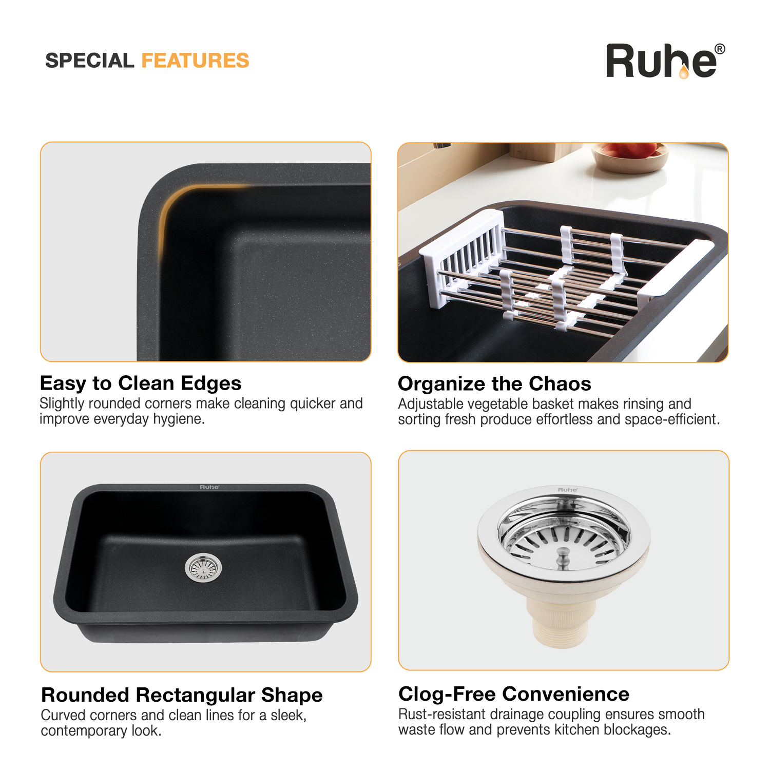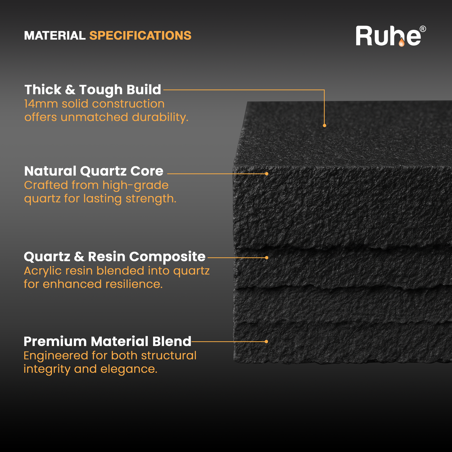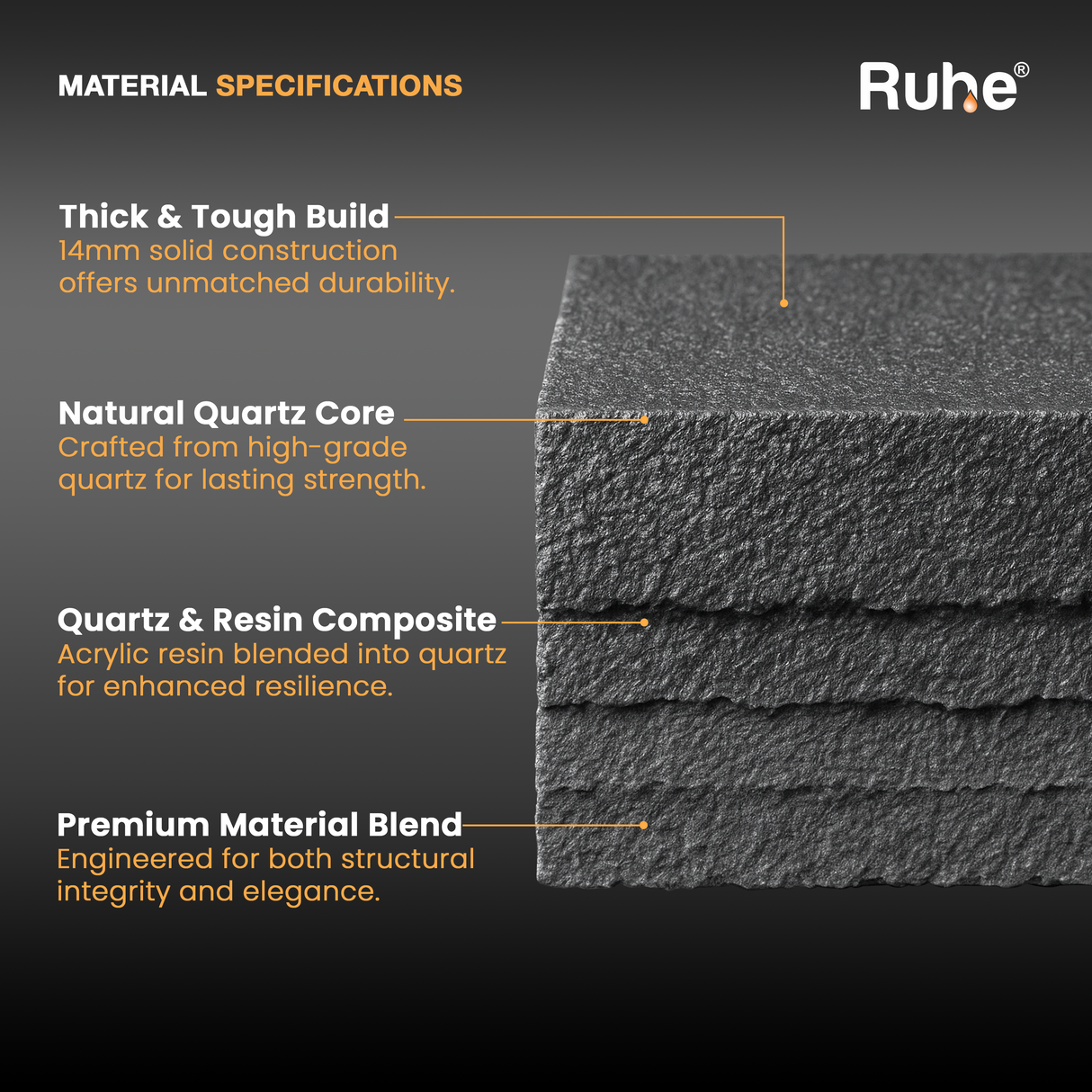 Crafted from 14mm thick quartz and resin, this rectangular single-bowl sink with rounded edges offers durability, hygiene, and a bold Matte Black finish.