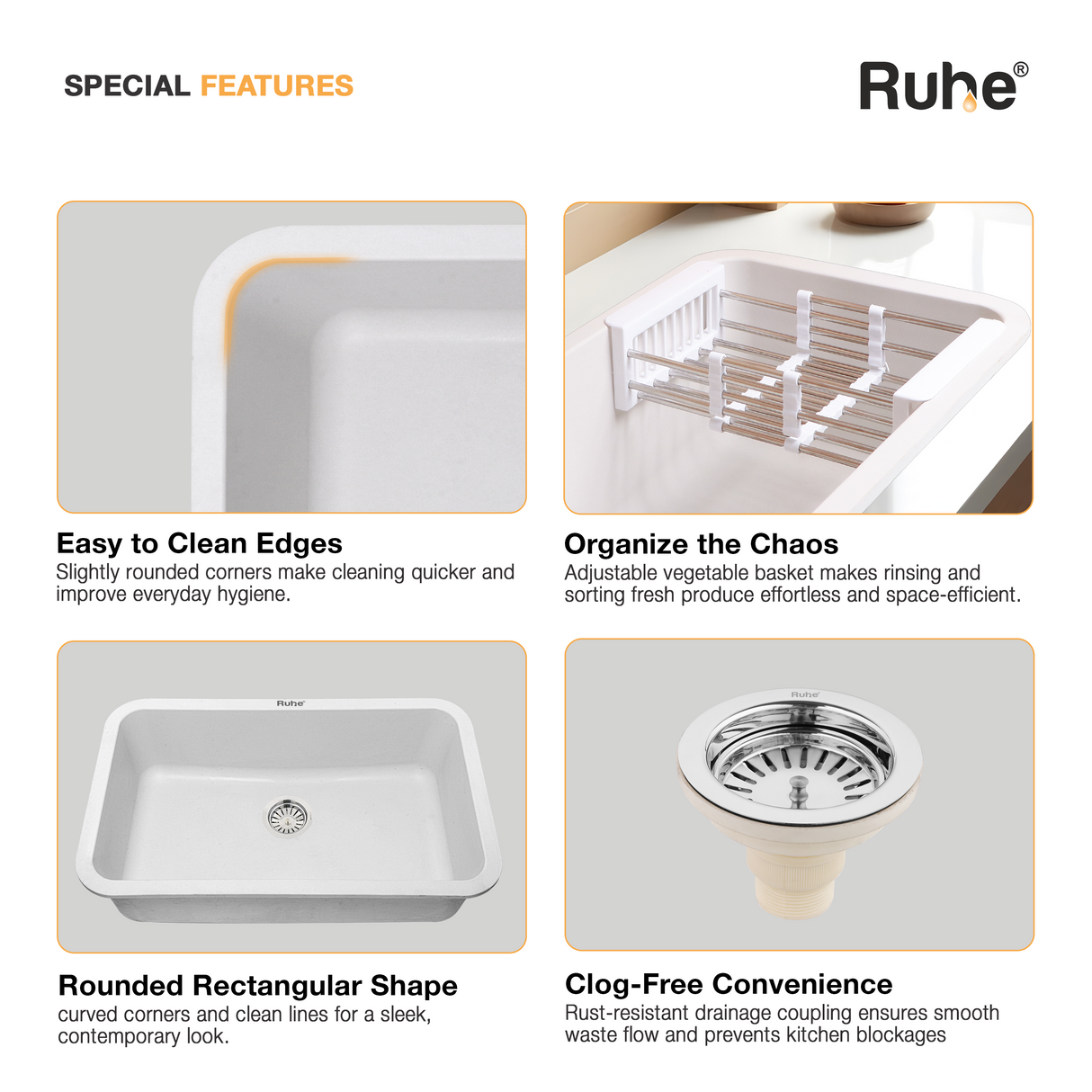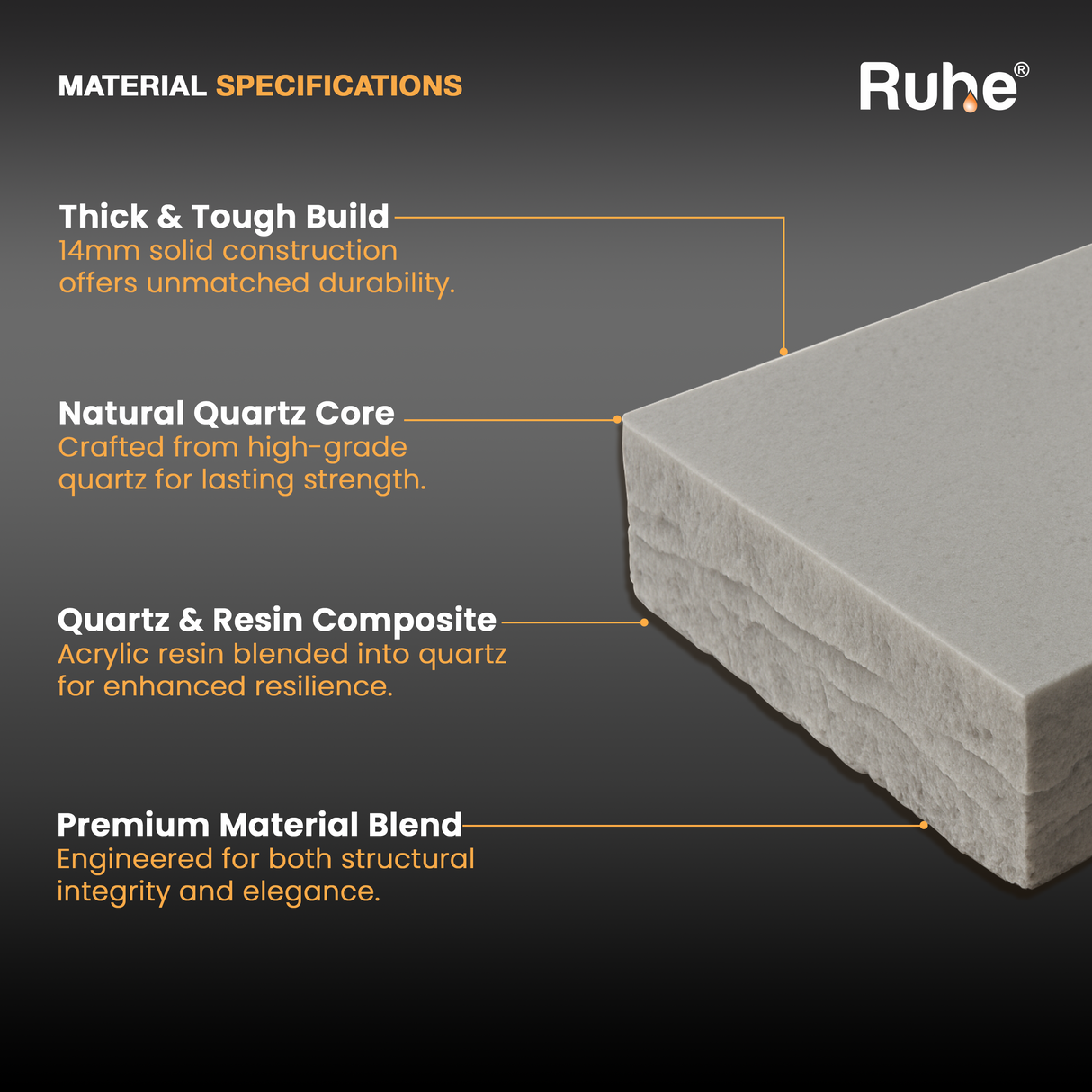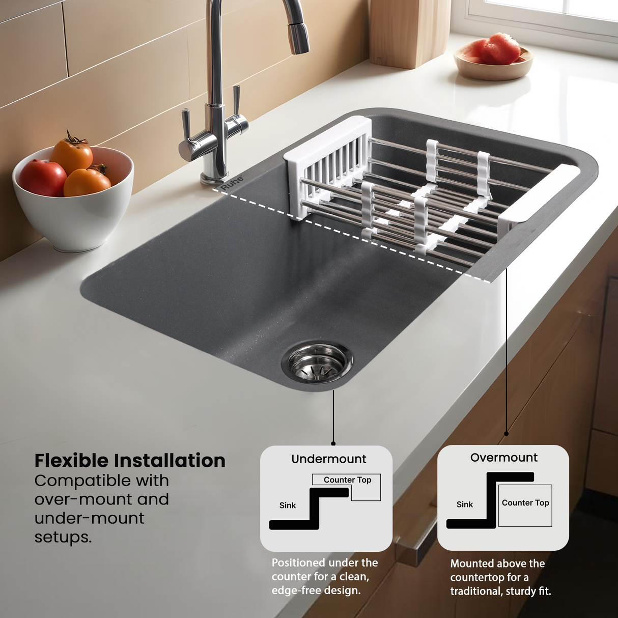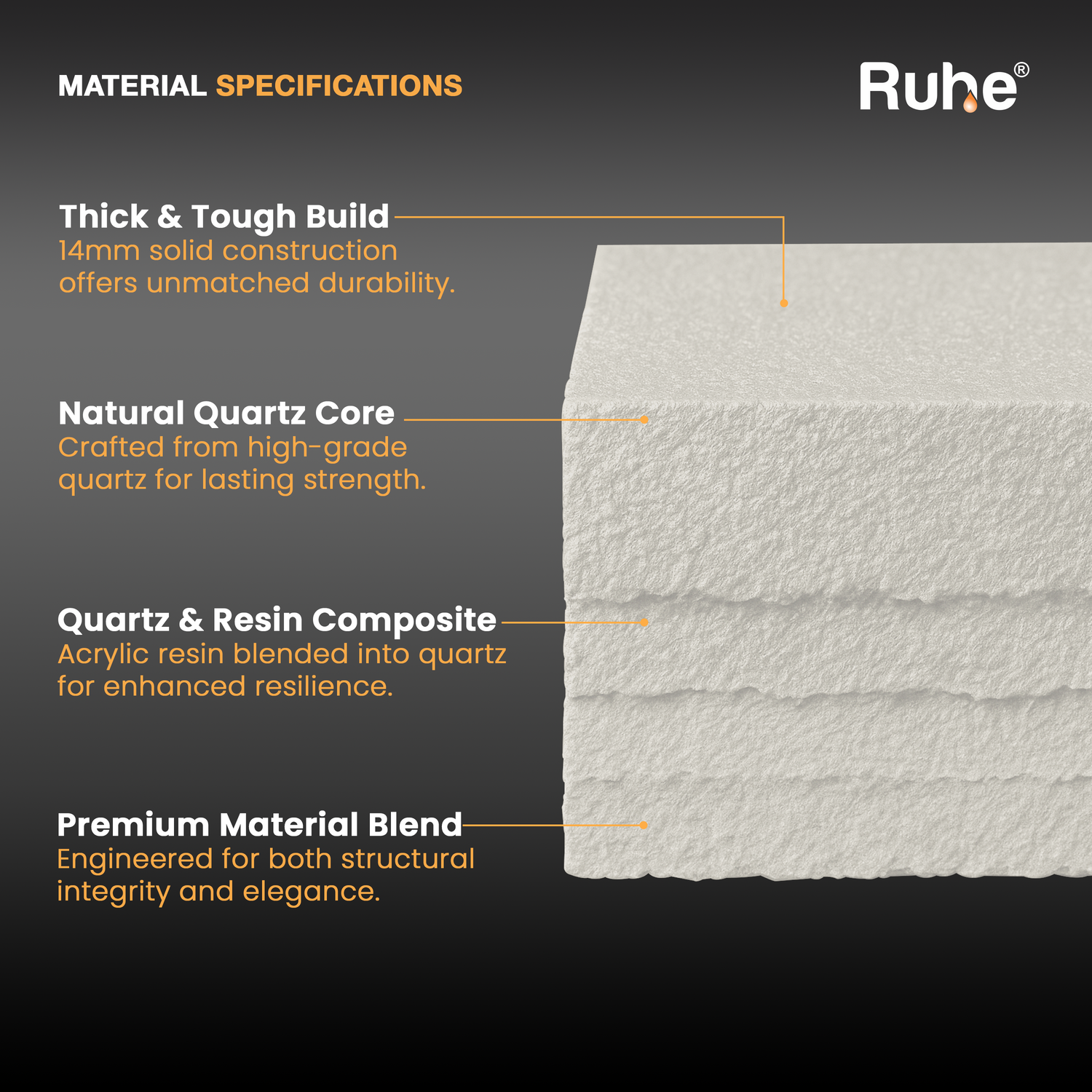 Crafted from 14mm thick quartz and resin, this rectangular single-bowl sink with rounded edges offers durability, hygiene, and a bold Matte Black finish.