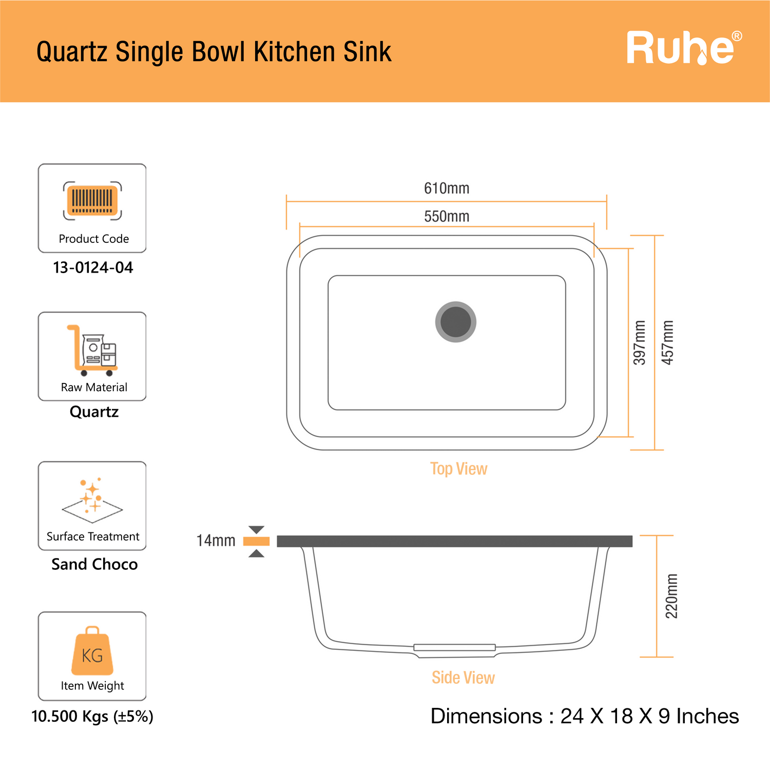 • Material: 14mm thick quartz and resin blend