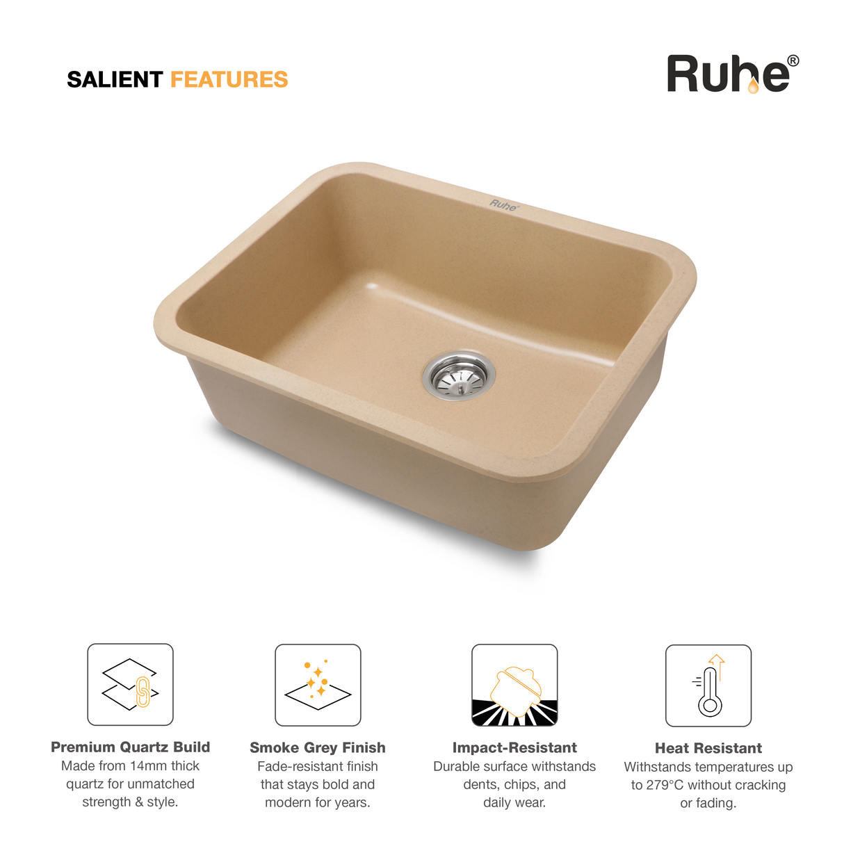 • Dense quartz build absorbs sound, minimizing water & utensil noise.