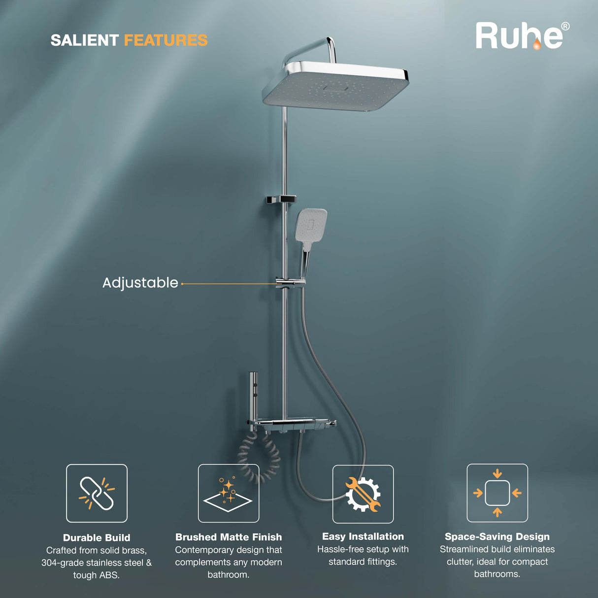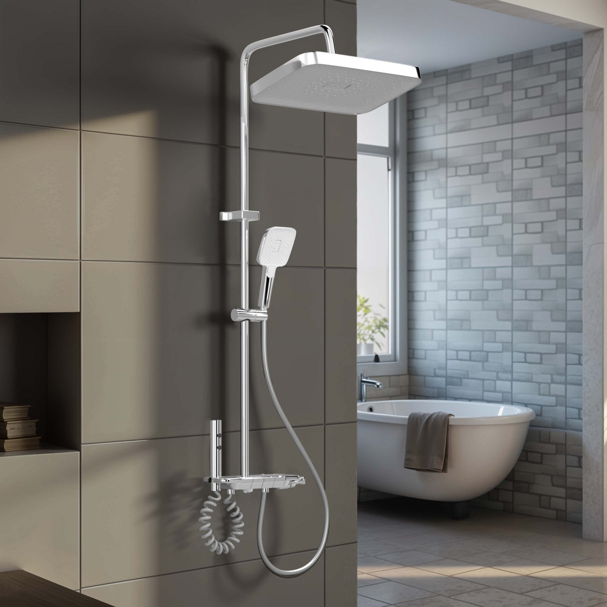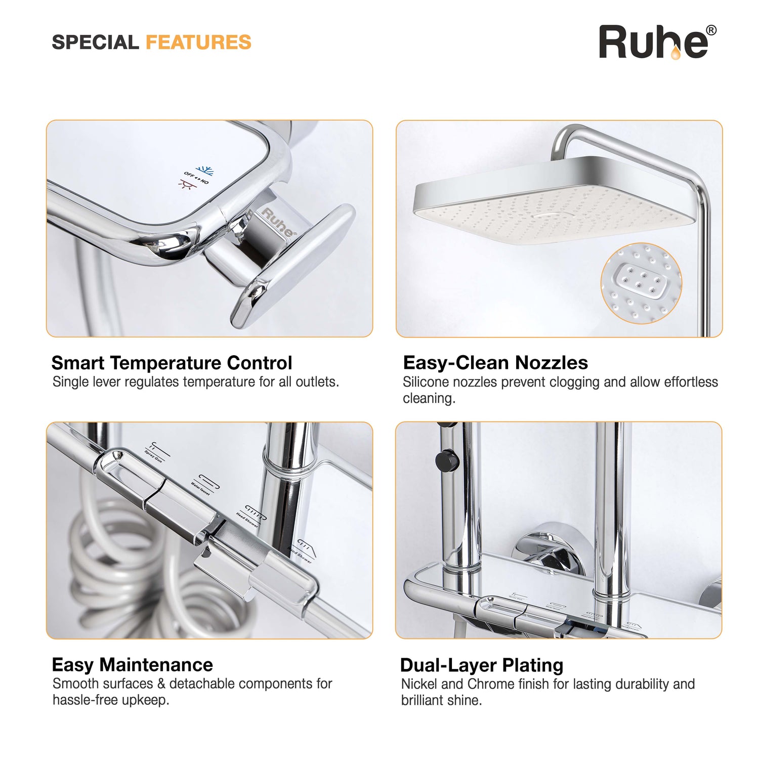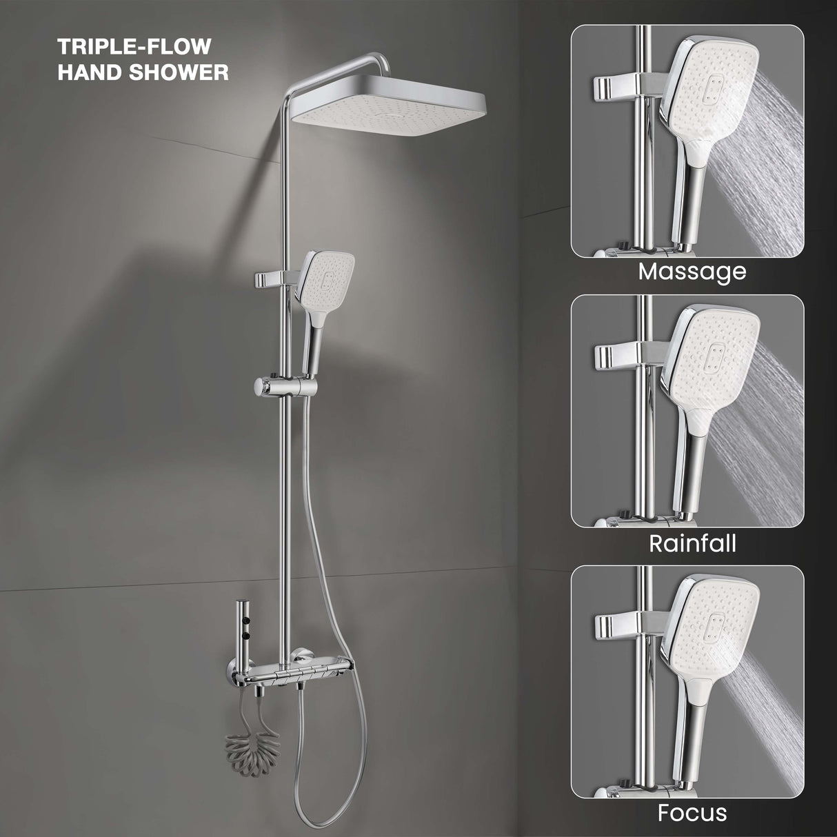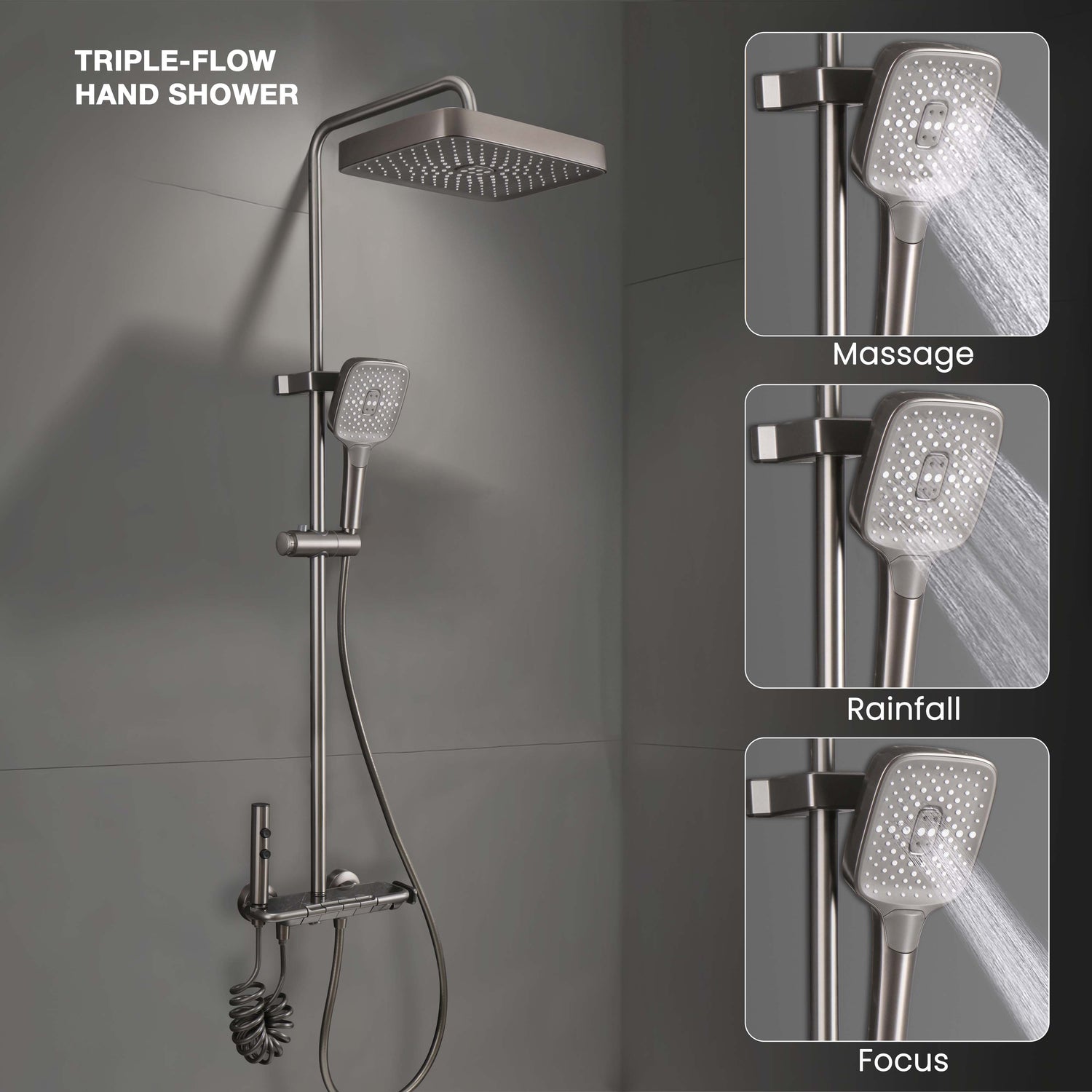 • Triple-flow hand shower with rainfall, massage & focus modes