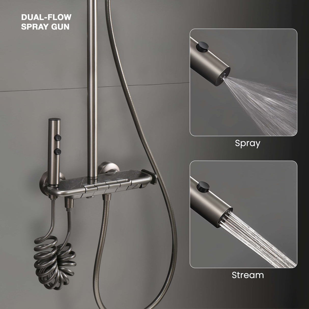 • Dual-flow spray gun for stream and spray functions