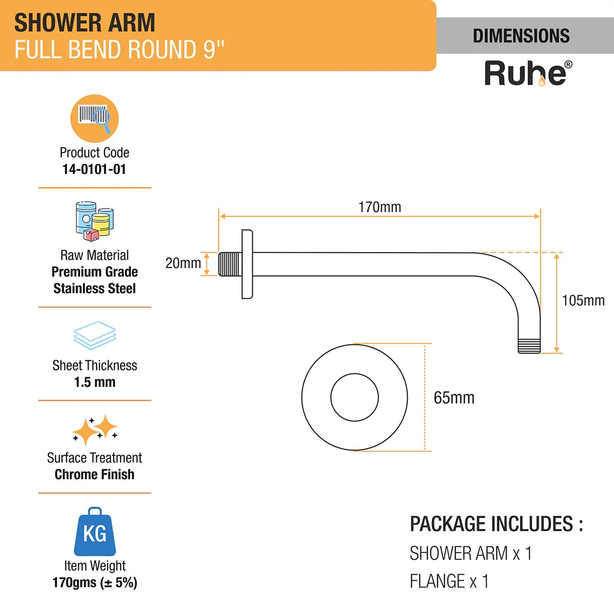 Round Full Bend Shower Arm (9 Inches) with Flange - by Ruhe