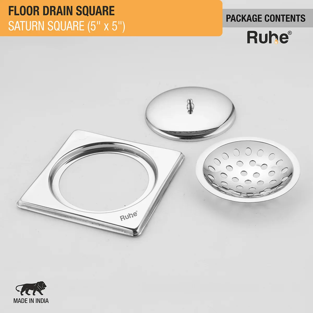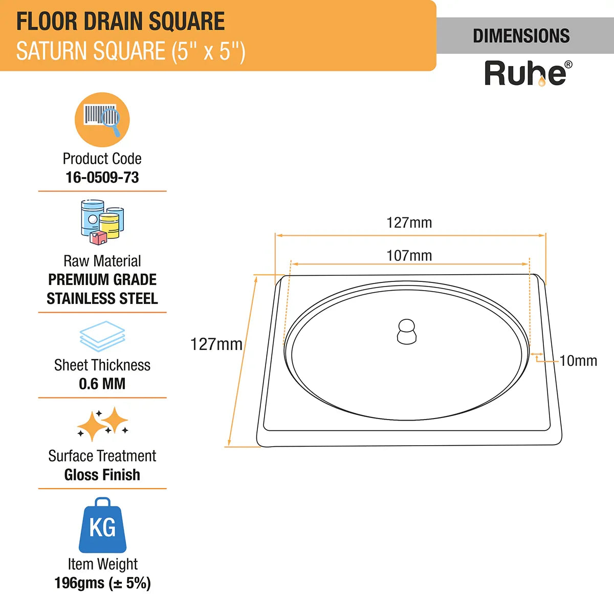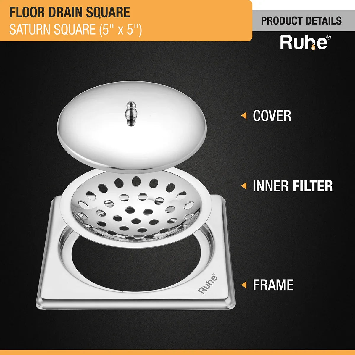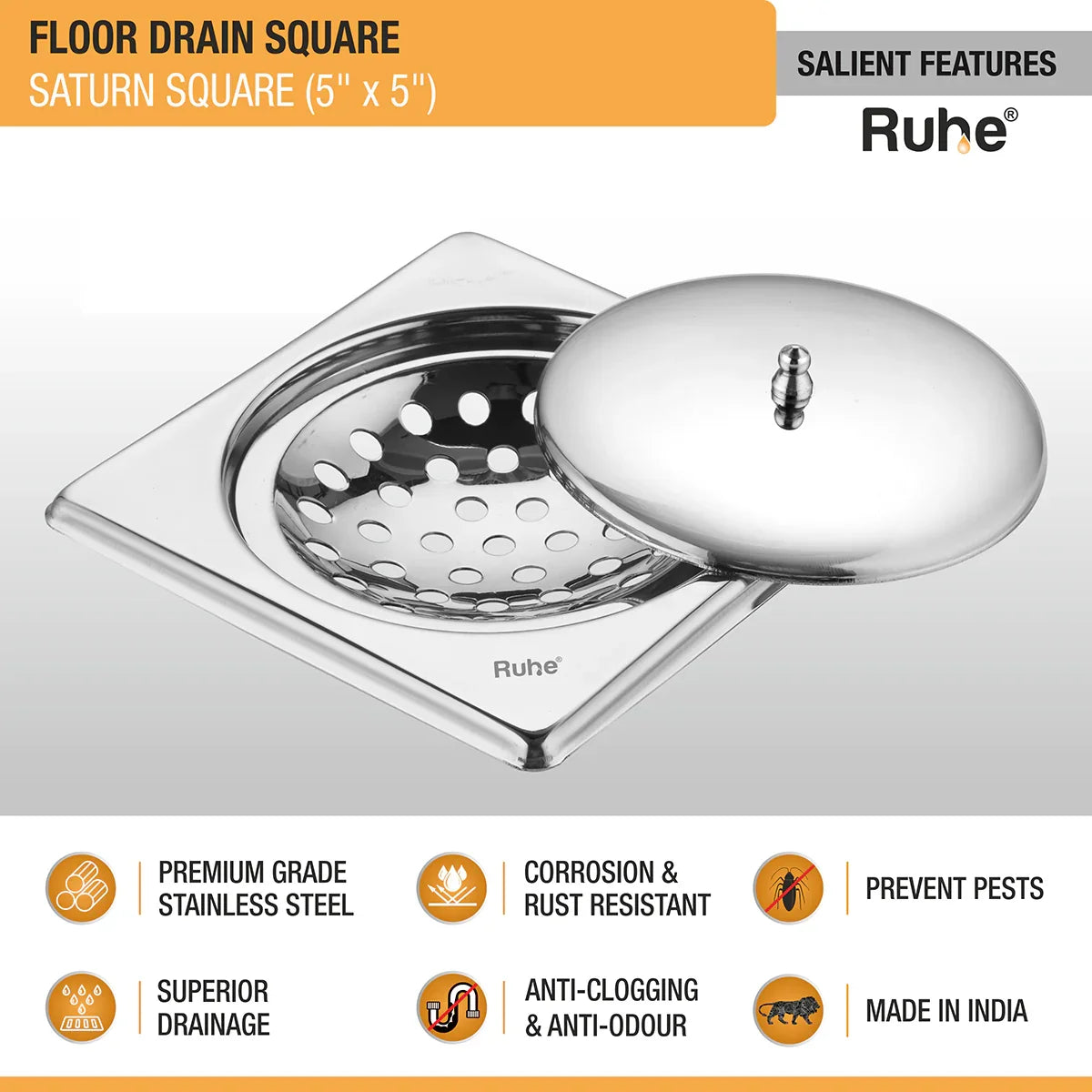 Ruhe Saturn Square Floor Drain is a smoothly manageable bathroom drain that comes with Lid to conceal the drain, and a knob on the lid to easily manage/handle it.