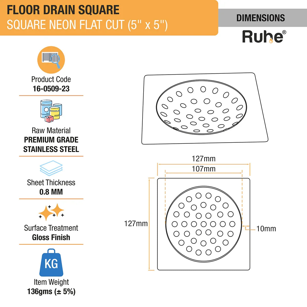 Ruhe Square Neon Flat Cut Floor Drain is a basic, most-selling and everlasting drain jali with intense efficacy and intricate design.