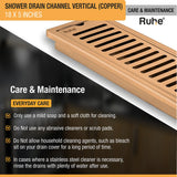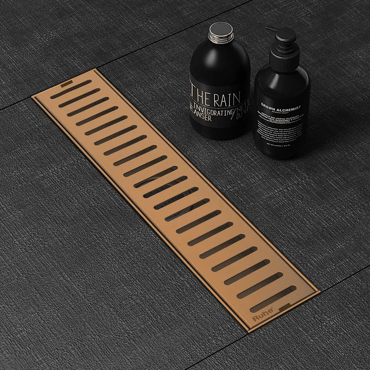 Ruhe Vertical Shower Drain Channels made with 1mm Thick 304-Grade Stainless Steel have a beautiful Rose Gold PVD Coating that offers a luxurious look and are meant to handle large volumes of water, come with a Side Hole (customizable), Drain Frame/Tray, Grating Top, Cockroach Trap and a 10 Year Warranty.