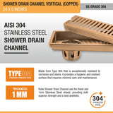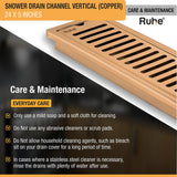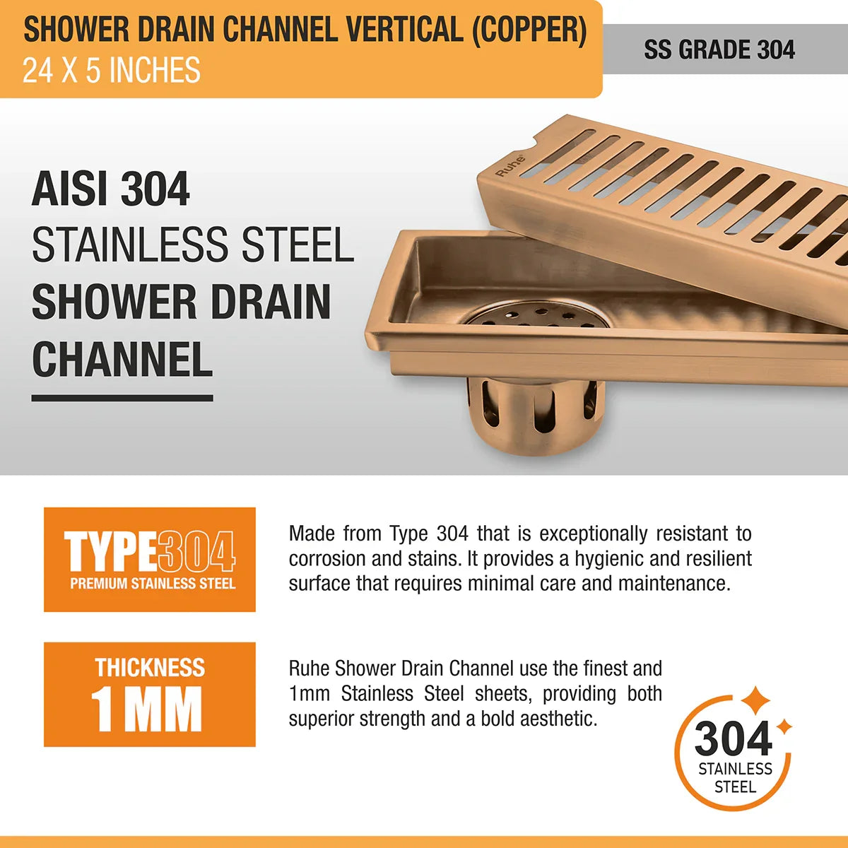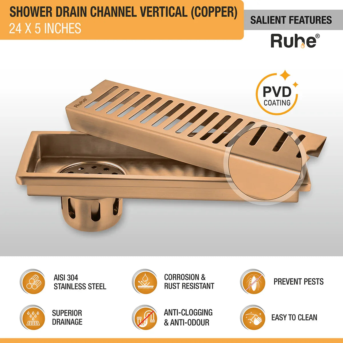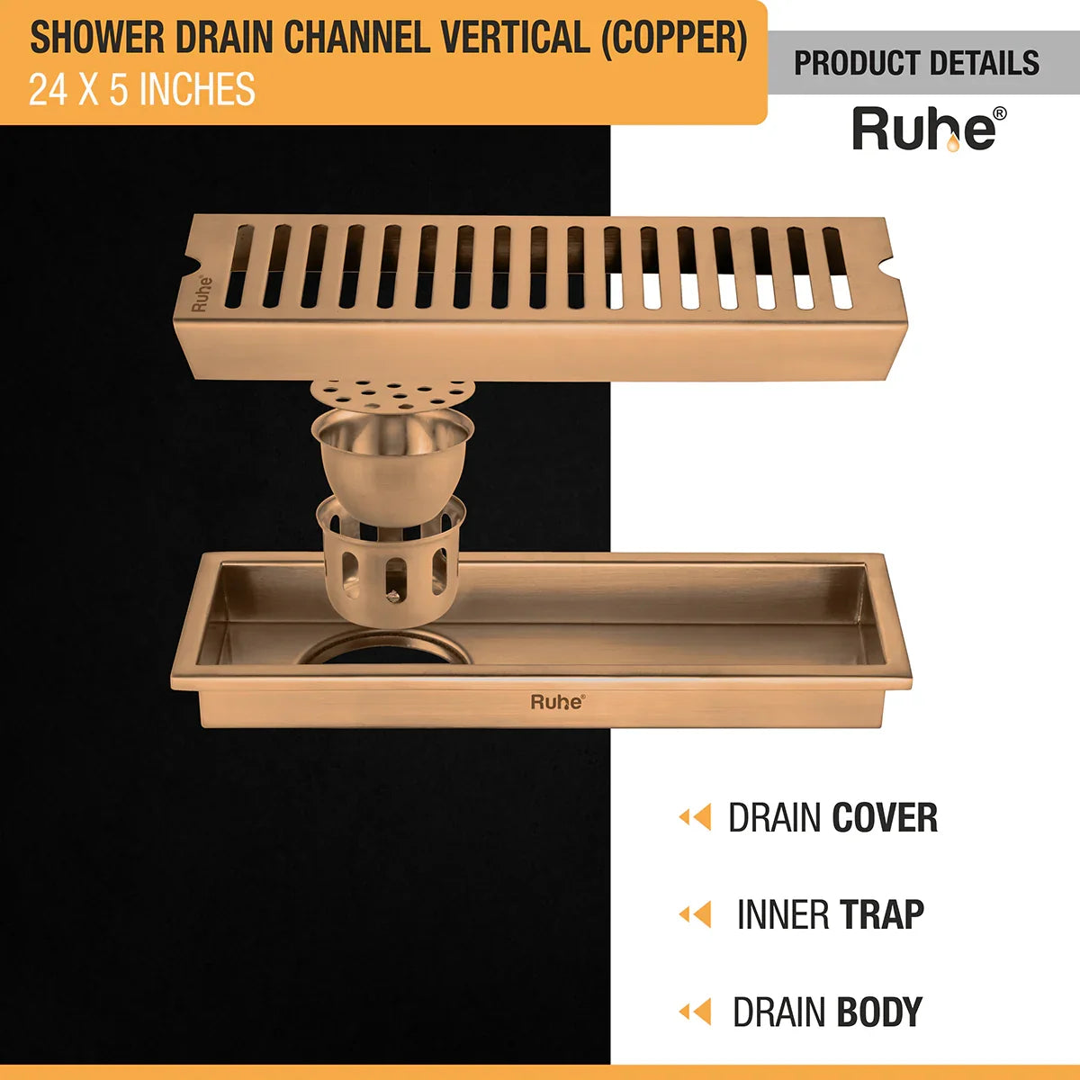 Ruhe Vertical Shower Drain Channels made with 1mm Thick 304-Grade Stainless Steel have a beautiful Rose Gold PVD Coating that offers a luxurious look and are meant to handle large volumes of water, come with a Side Hole (customizable), Drain Frame/Tray, Grating Top, Cockroach Trap and a 10 Year Warranty.