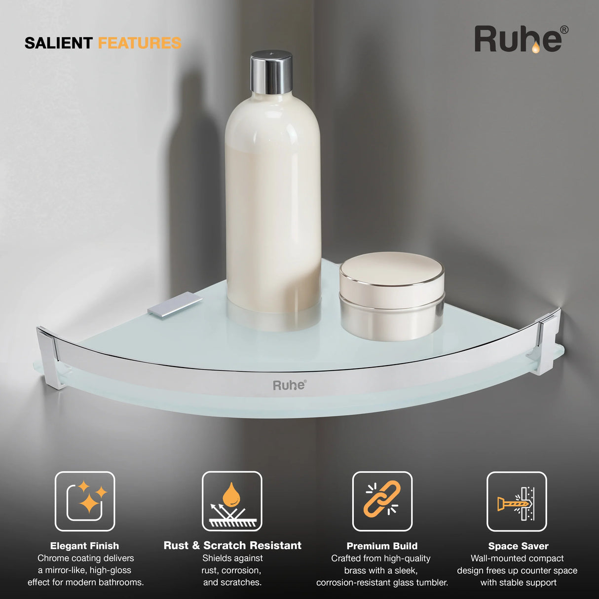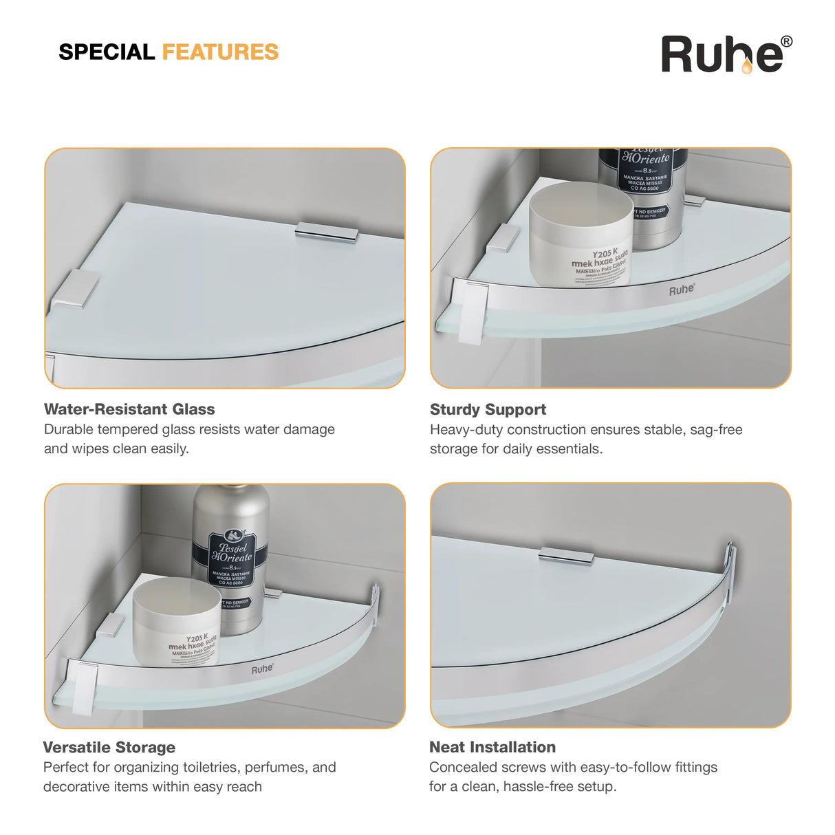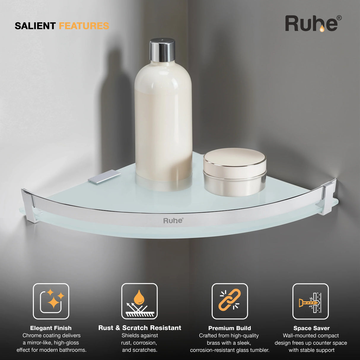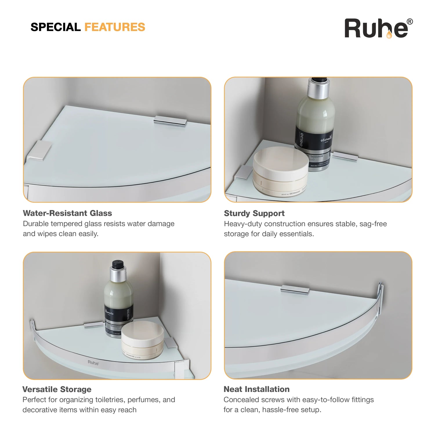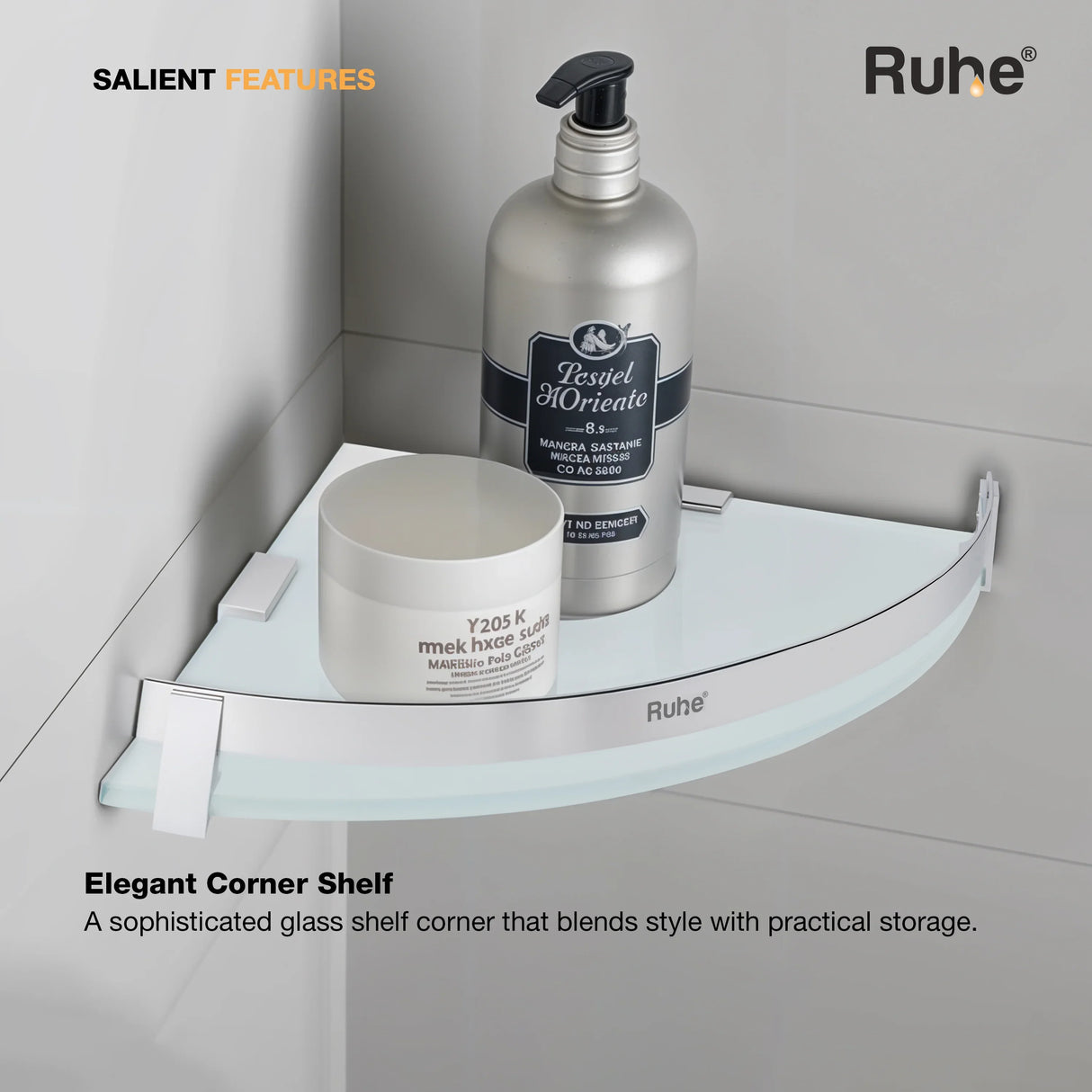 GLASS SHELF CORNER: A sleek frosted glass shelf corner that adds a refined touch while offering a secure platform for organizing essentials in compact bathroom spaces.