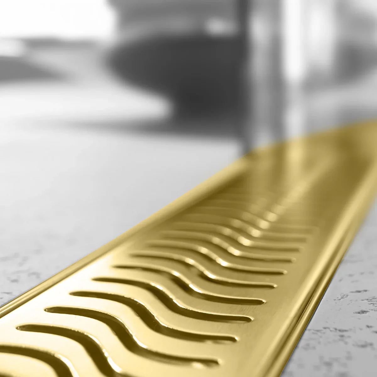 Ruhe Wave Shower Drain Channels made with 1mm Thick 304-Grade Stainless Steel have a beautiful Yellow Gold PVD Coating that offers a luxurious look and are meant to handle large volumes of water, come with a Side Hole (customizable), Drain Frame/Tray, Grating Top, Cockroach Trap and a 10 Years Warranty.