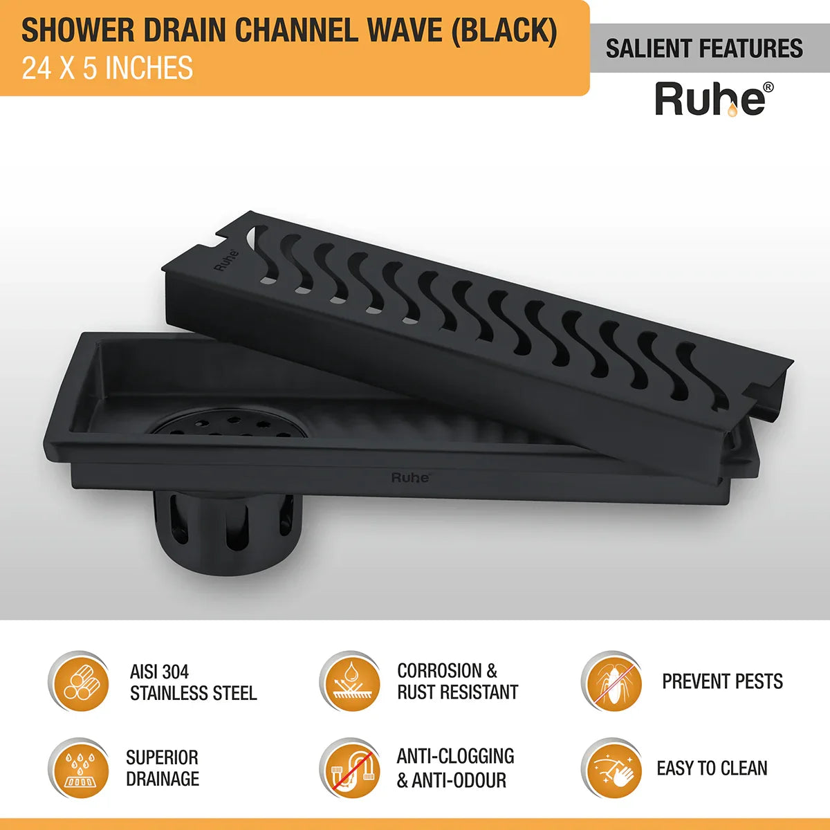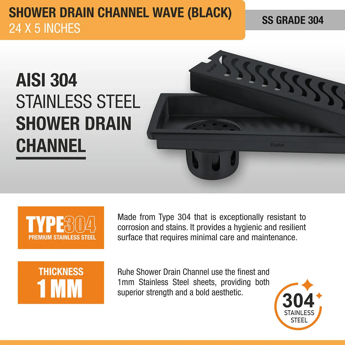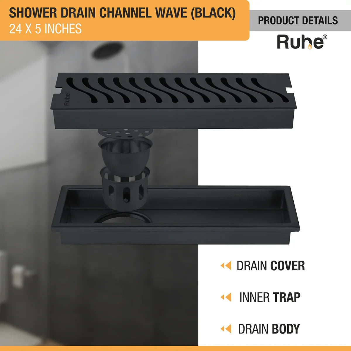 Ruhe Wave Shower Drain Channels made with 1mm Thick 304-Grade Stainless Steel have a beautiful Black PVD Coating that offers a luxurious look and are meant to handle large volumes of water, come with a Side Hole (customizable), Drain Frame/Tray, Grating Top, Cockroach Trap and a 10 Year Warranty.