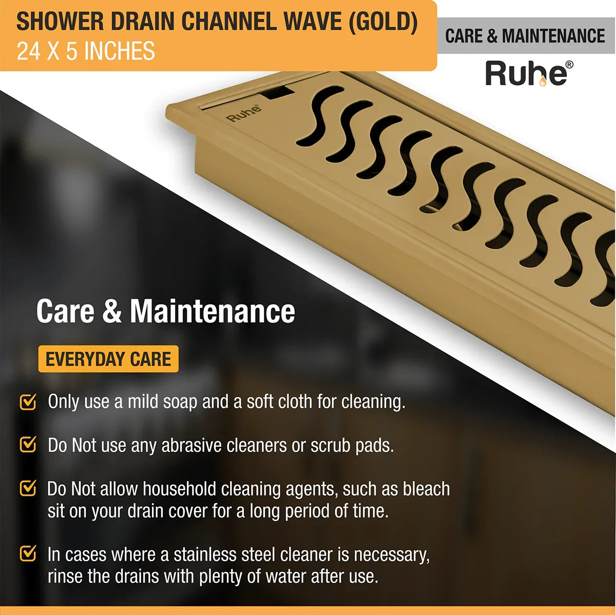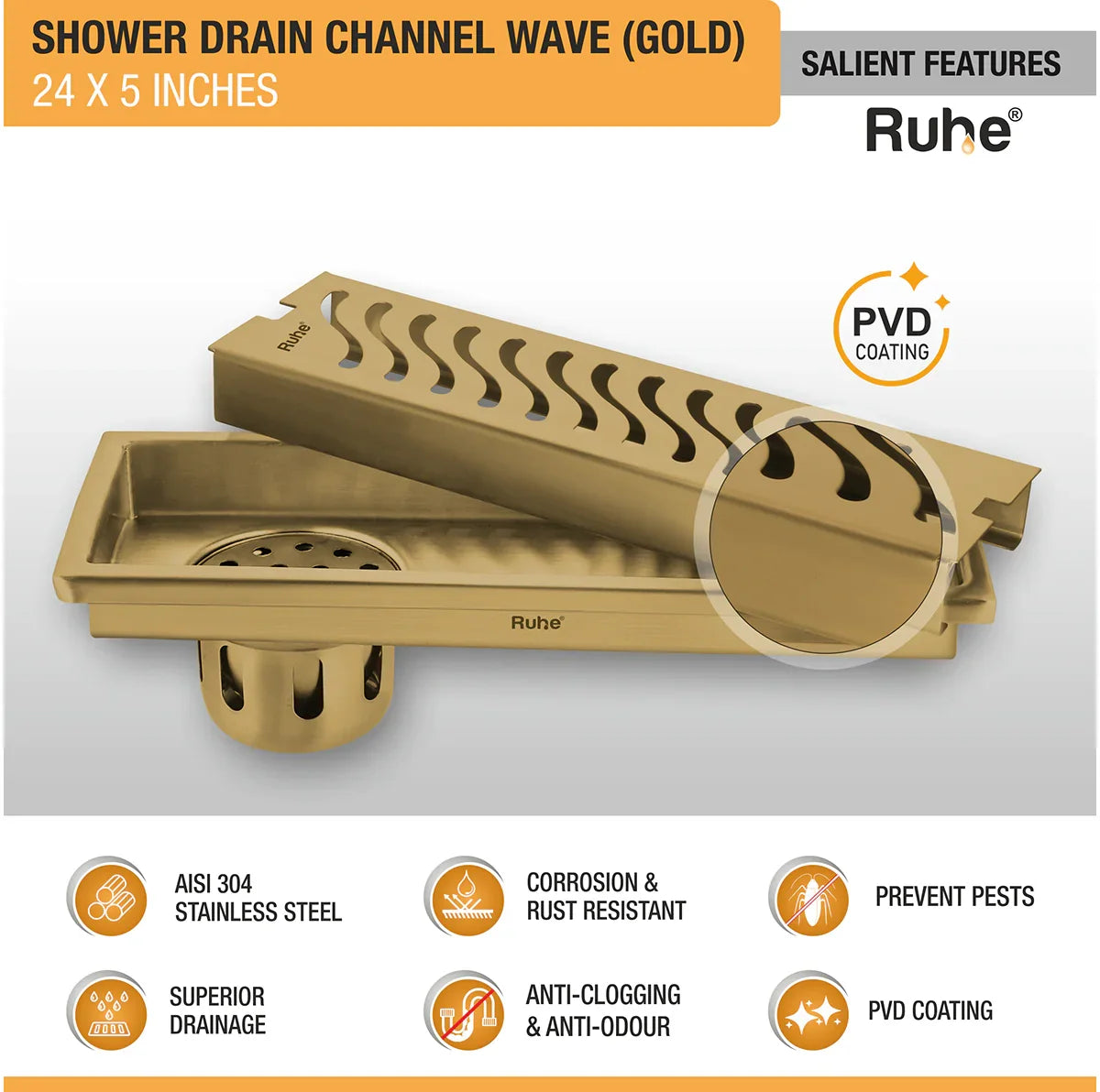 Ruhe Wave Shower Drain Channels made with 1mm Thick 304-Grade Stainless Steel have a beautiful Yellow Gold PVD Coating that offers a luxurious look and are meant to handle large volumes of water, come with a Side Hole (customizable), Drain Frame/Tray, Grating Top, Cockroach Trap and a 10 Years Warranty.