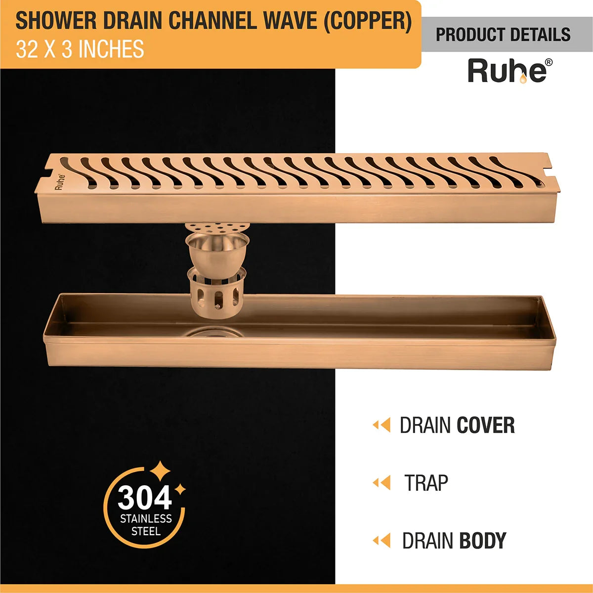 Ruhe Wave Shower Drain Channels made with 1mm Thick 304-Grade Stainless Steel have a beautiful Rose Gold PVD Coating that offers a luxurious look and are meant to handle large volumes of water, come with a Side Hole (customizable), Drain Frame/Tray, Grating Top, Cockroach Trap and a 10 Years Warranty.