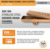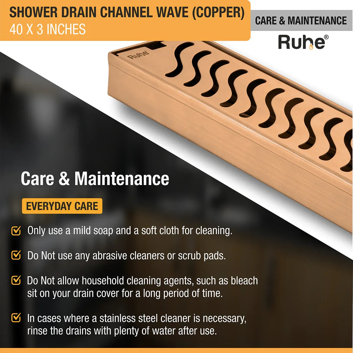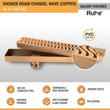 Ruhe Wave Shower Drain Channels made with 1mm Thick 304-Grade Stainless Steel have a beautiful Rose Gold PVD Coating that offers a luxurious look and are meant to handle large volumes of water, come with a Side Hole (customizable), Drain Frame/Tray, Grating Top, Cockroach Trap and a 10 Years Warranty.
