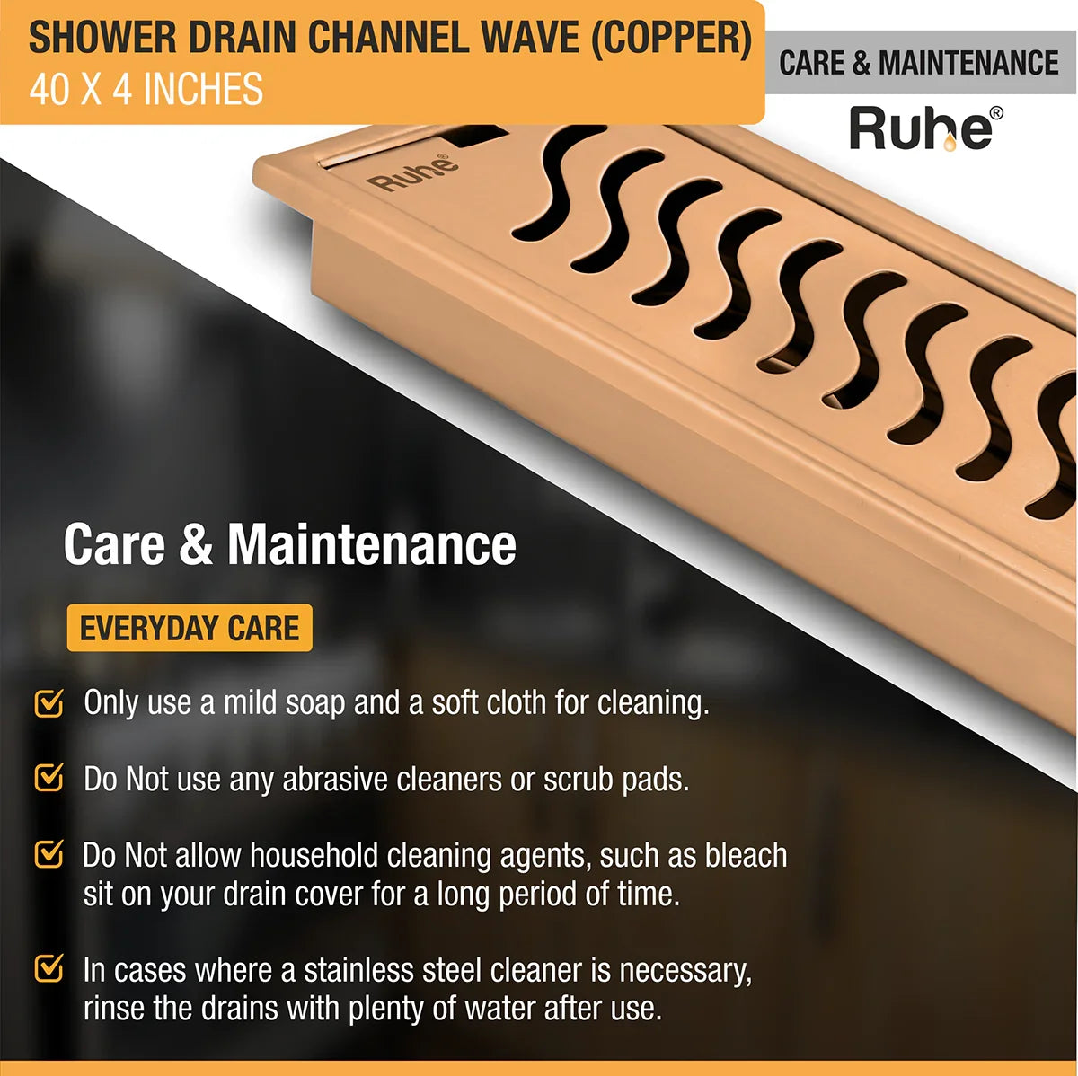 Ruhe Wave Shower Drain Channels made with 1mm Thick 304-Grade Stainless Steel have a beautiful Rose Gold PVD Coating that offers a luxurious look and are meant to handle large volumes of water, come with a Side Hole (customizable), Drain Frame/Tray, Grating Top, Cockroach Trap and a 10 Years Warranty.