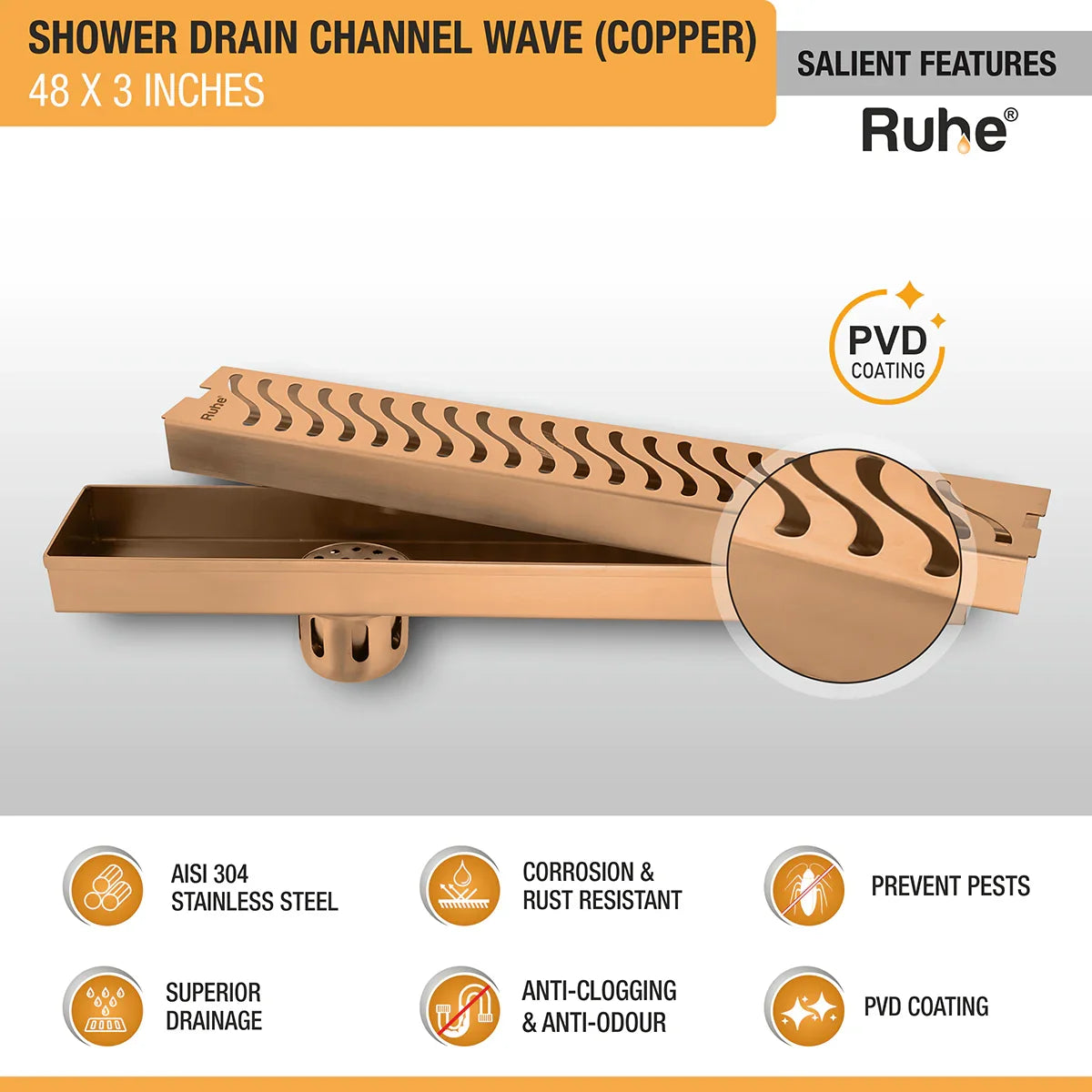 Ruhe Wave Shower Drain Channels made with 1mm Thick 304-Grade Stainless Steel have a beautiful Rose Gold PVD Coating that offers a luxurious look and are meant to handle large volumes of water, come with a Side Hole (customizable), Drain Frame/Tray, Grating Top, Cockroach Trap and a 10 Years Warranty.